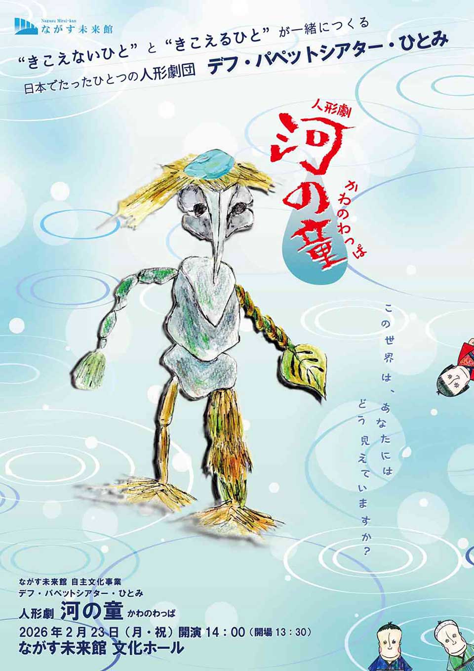 耳が聞こえない人と聞こえる人が共に創作活動を行う人形劇団の公演。河童(かっぱ)と人間が共生する世界を描きます。