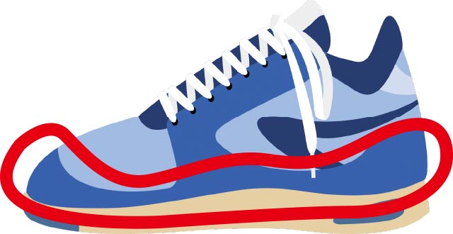 • 端(赤で囲んだ部分)に硬い素材が入っていて、靴の中で足が横に動かない
